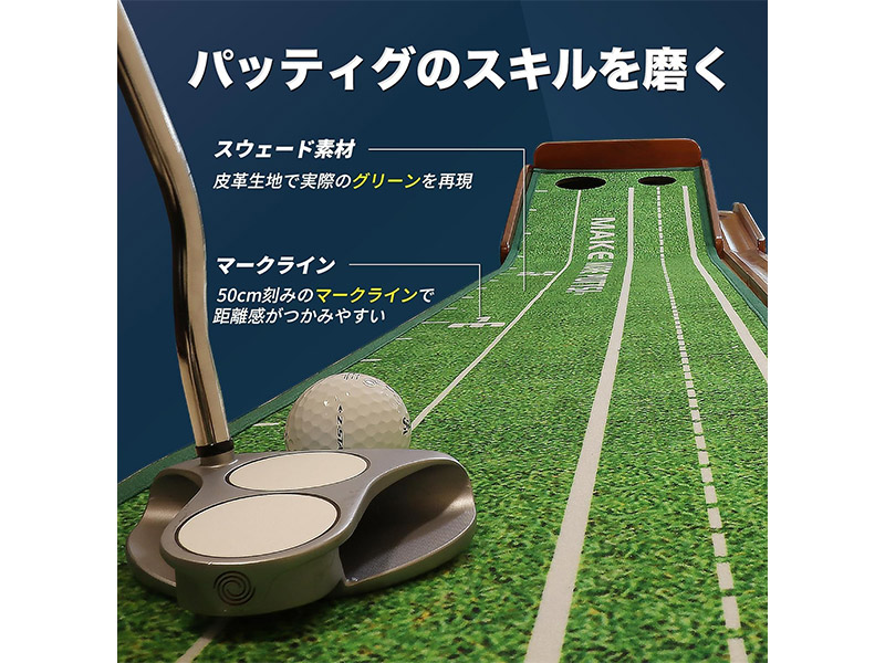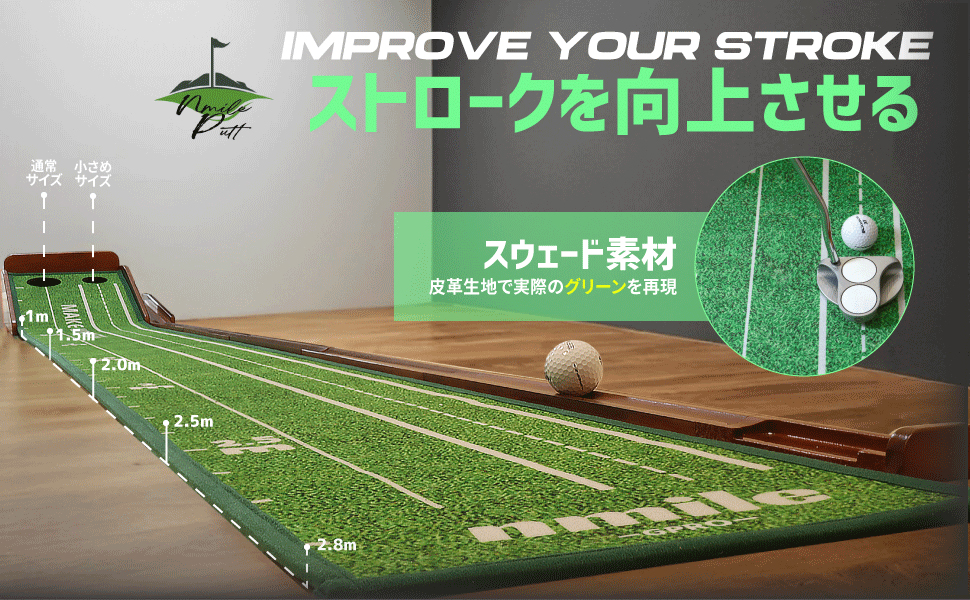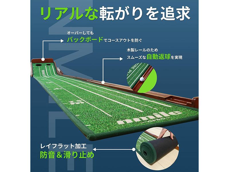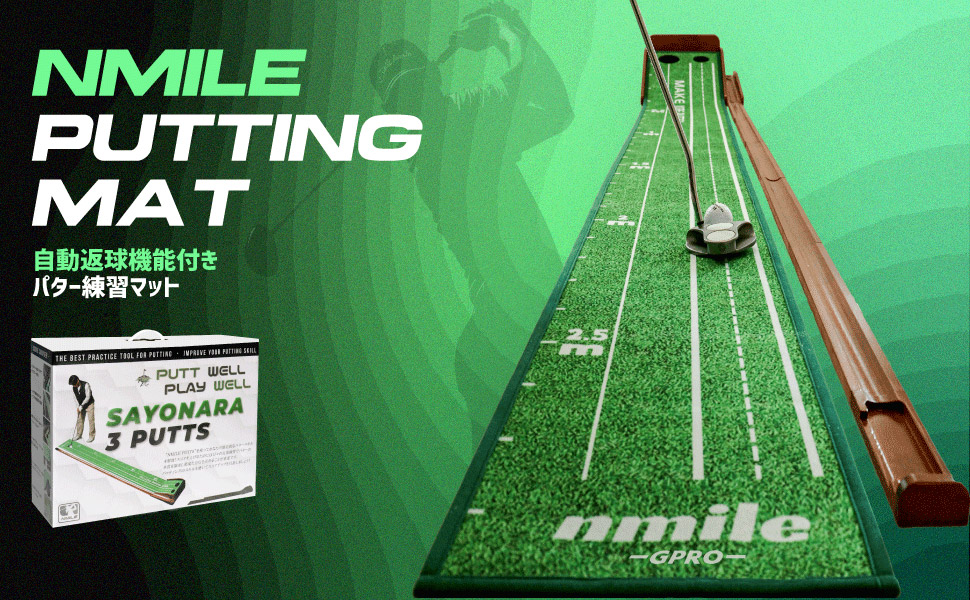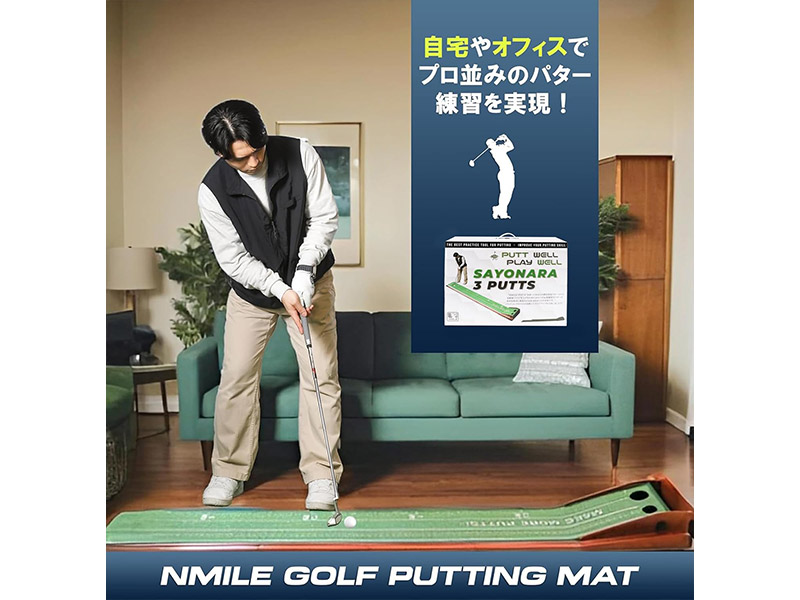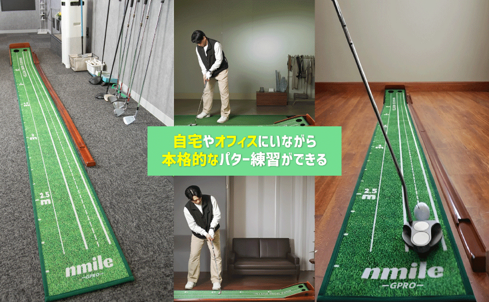【nmile】エヌマイルのゴルフパター練習マットは、自宅やオフィスにいながら本格的なパター練習ができるパッティングマットです。リアルに近い練習ができるのでプロにも使用されています。nmile(エヌマイル)のパッティングマットは、多くの方のパター上達をサポートします。
